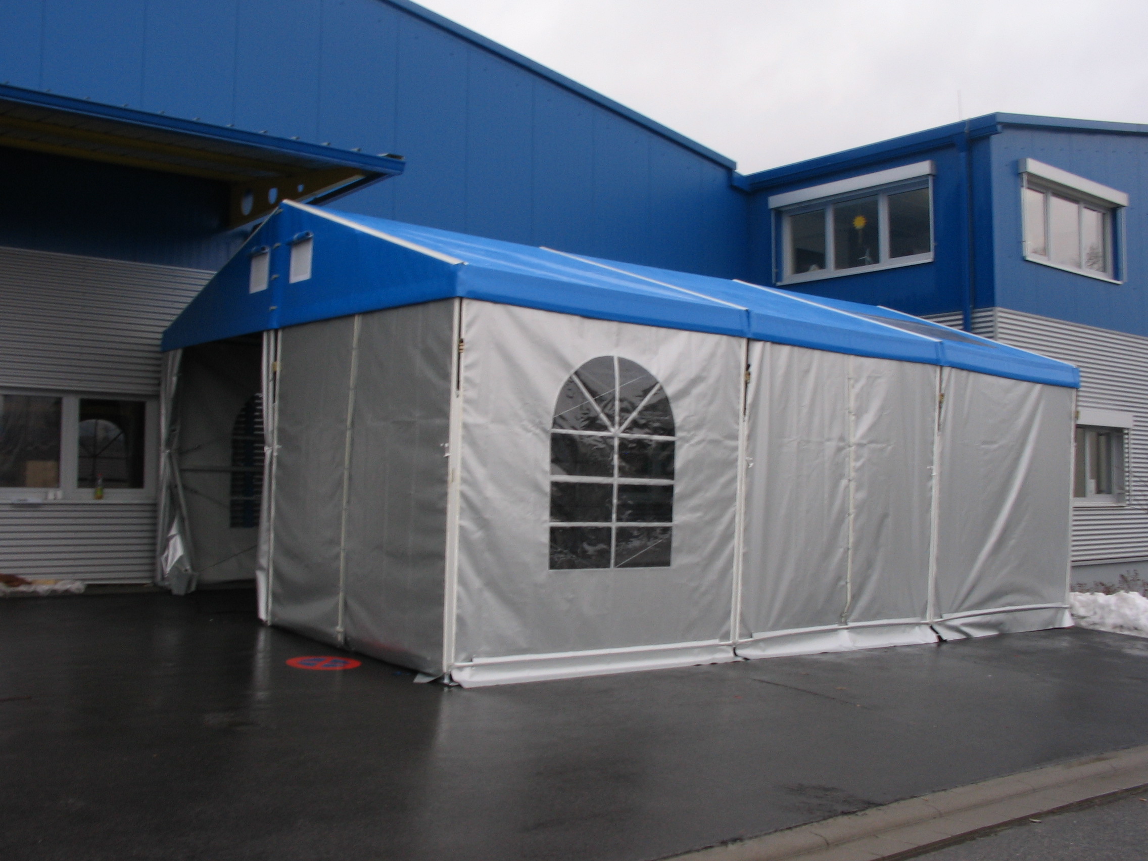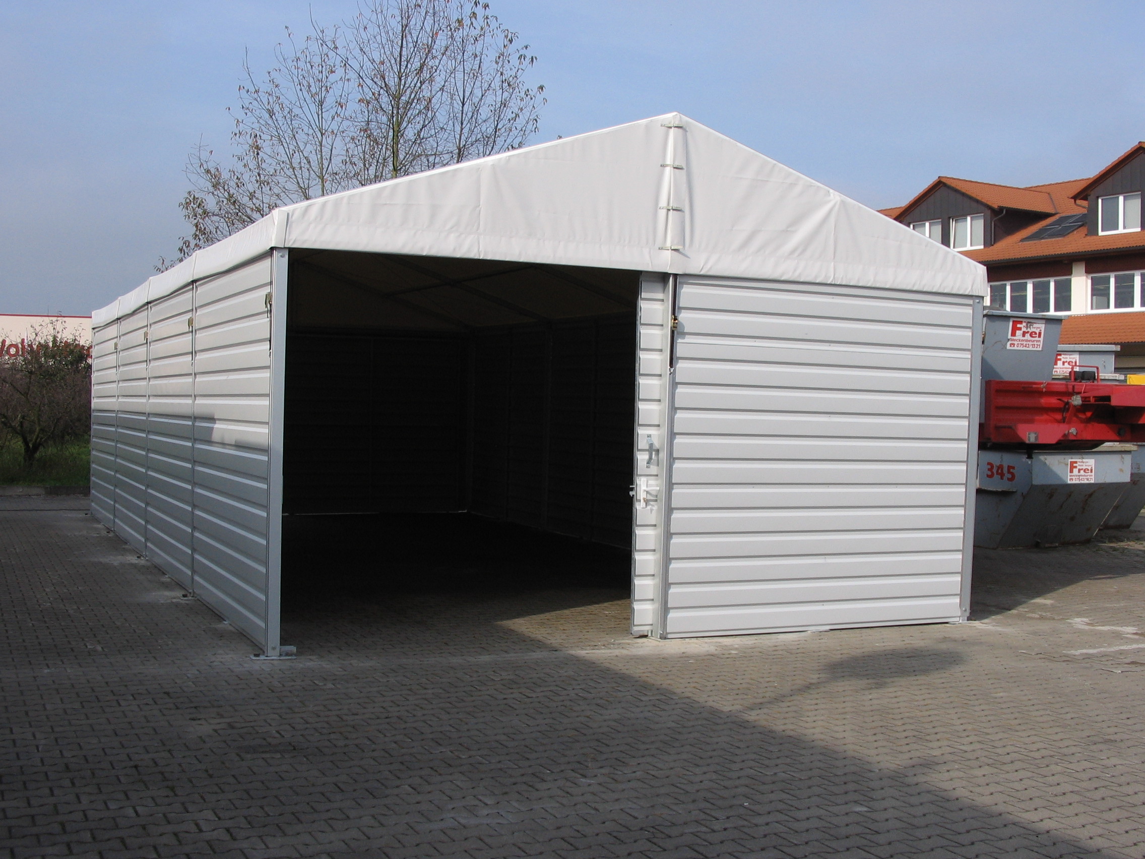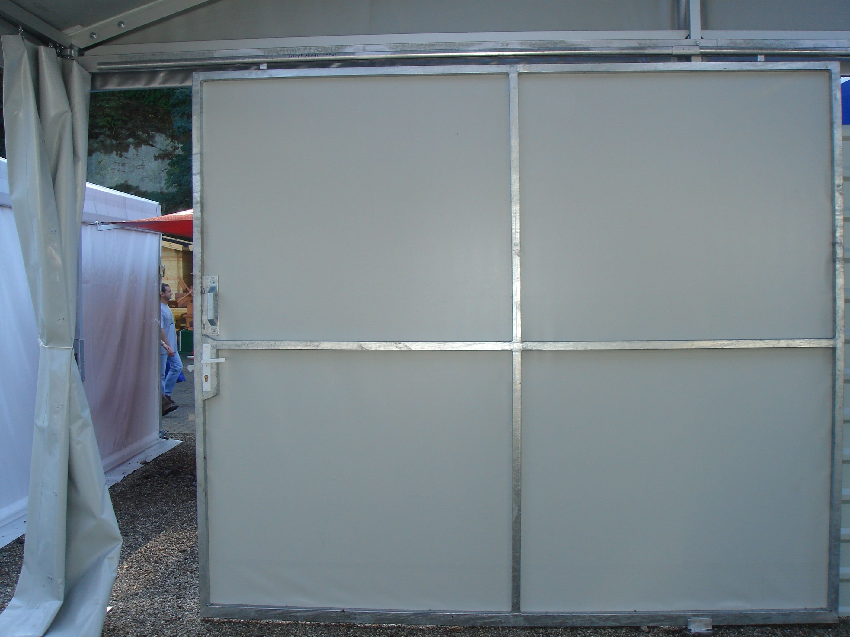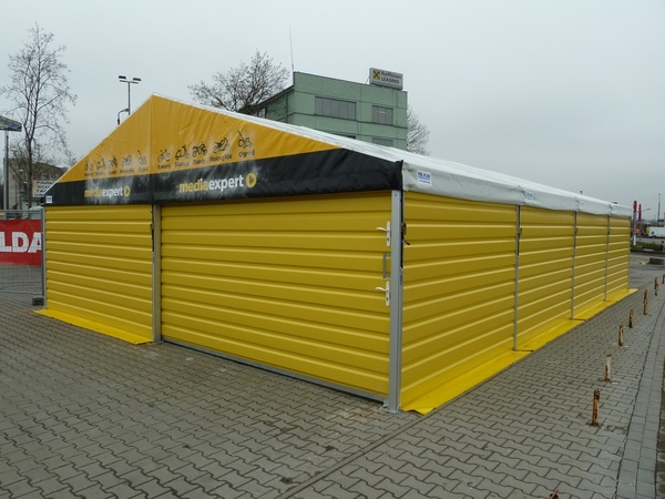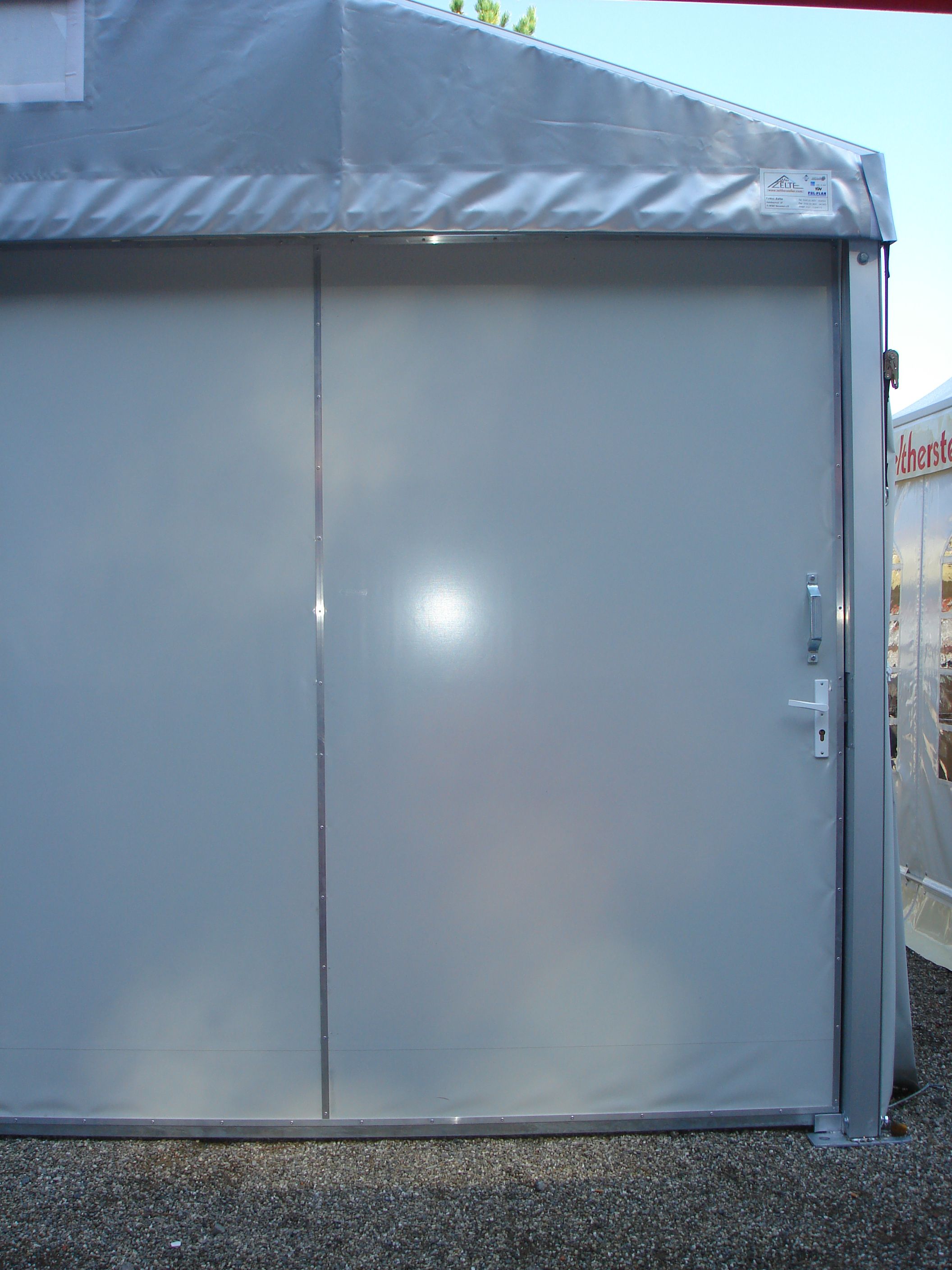 Čelní a boční plachty párty stanu mohou být nahrazeny trapézovým pozinkovaným plechem T35 s lakoplastovou úpravou nebo kvalitními ABS panely. Tento typ opláštění je často využíván pro zvýšené zabezpečení skladovaného zboží.