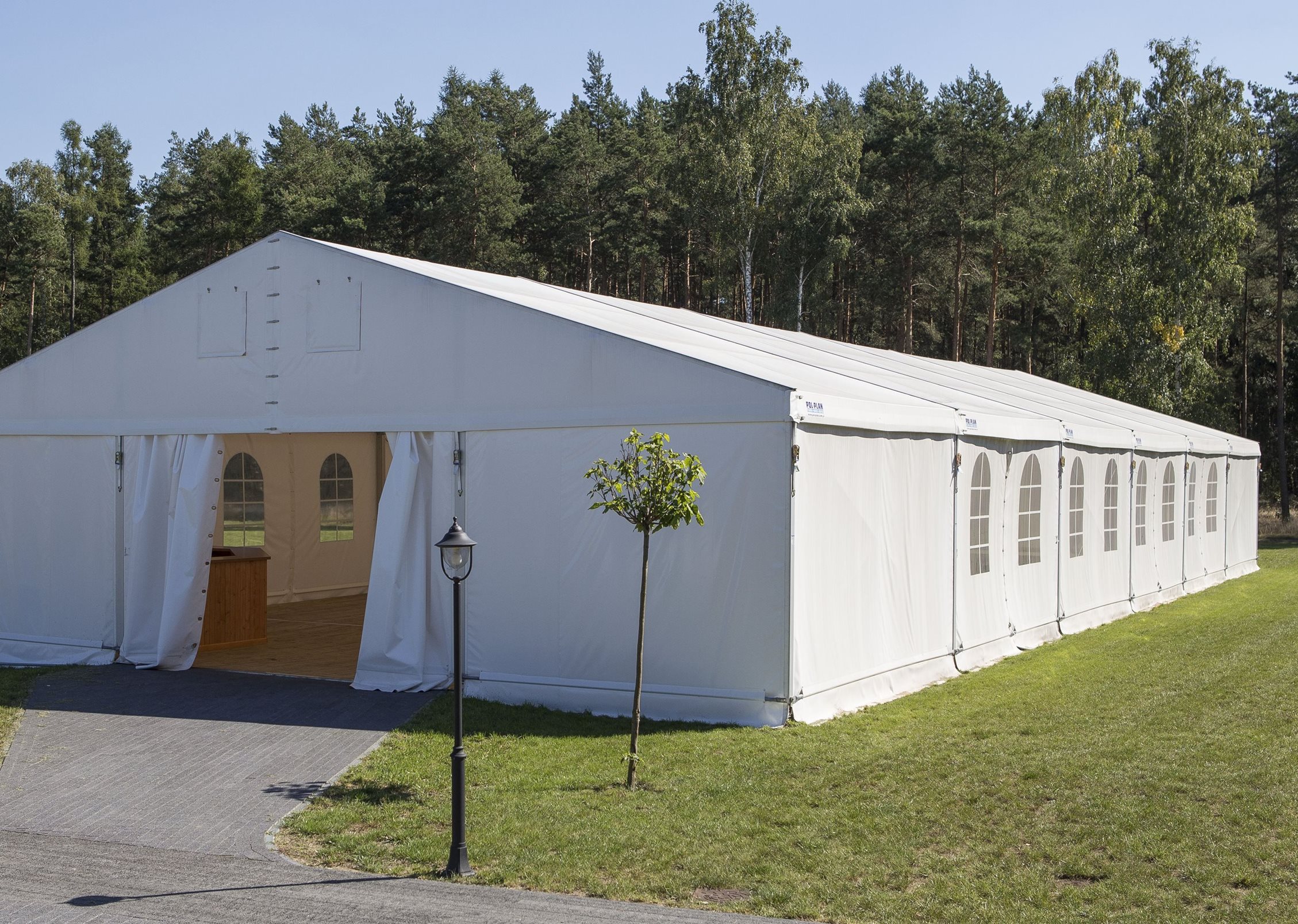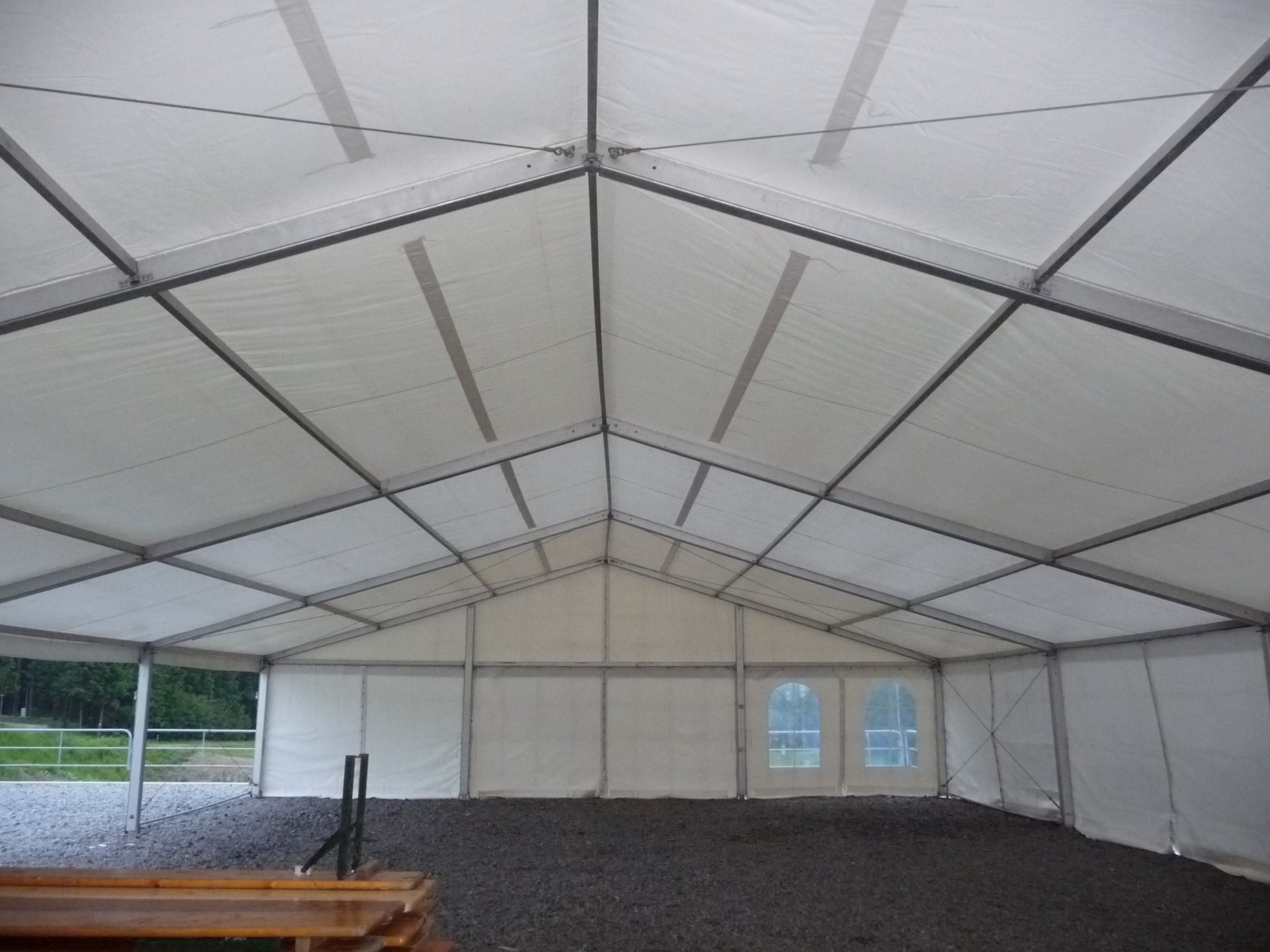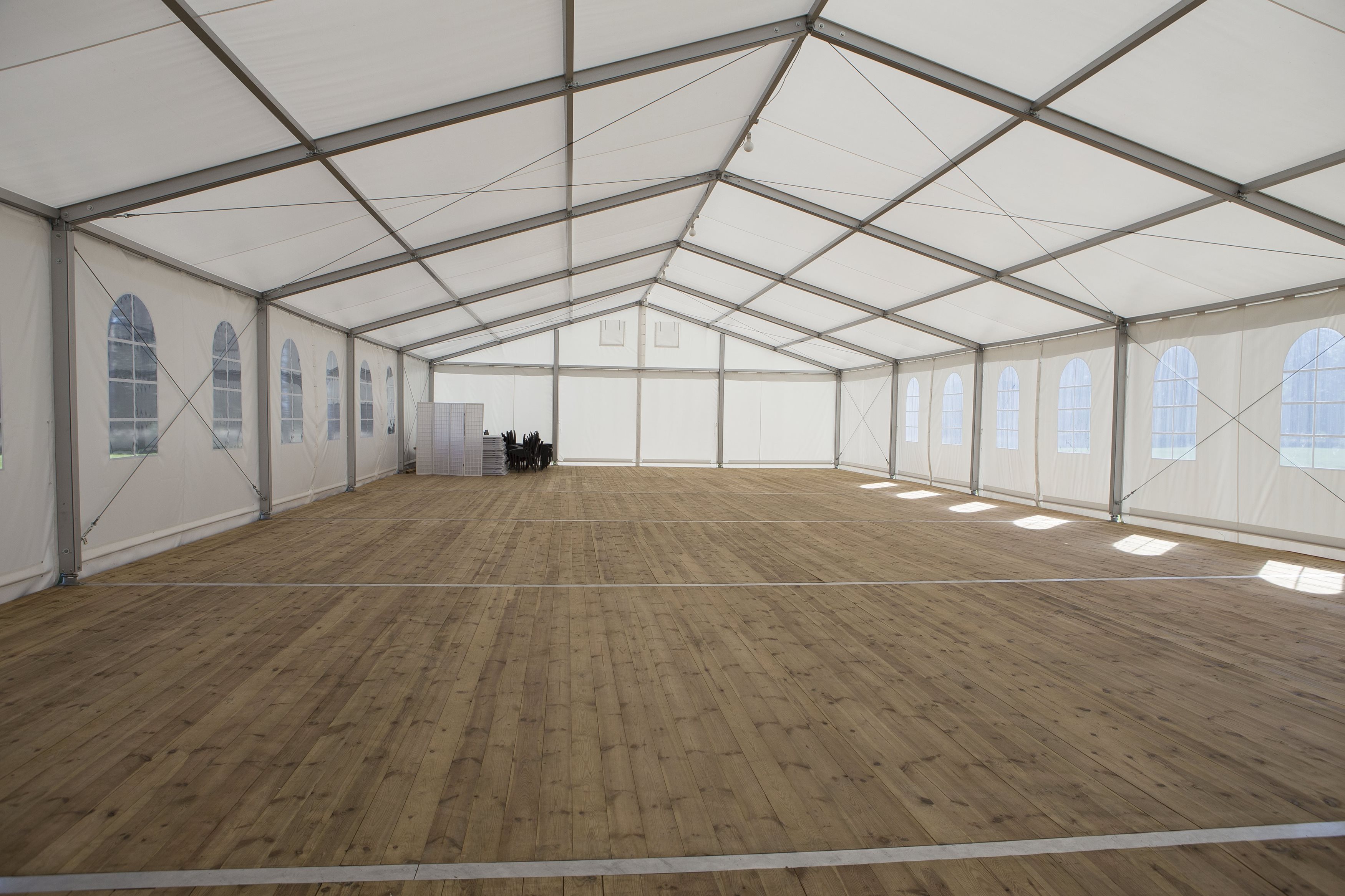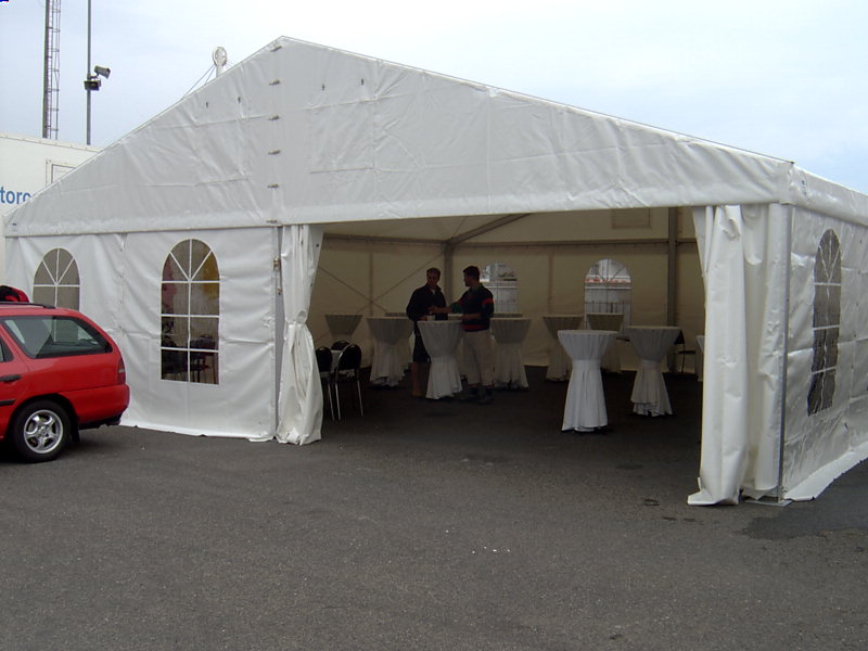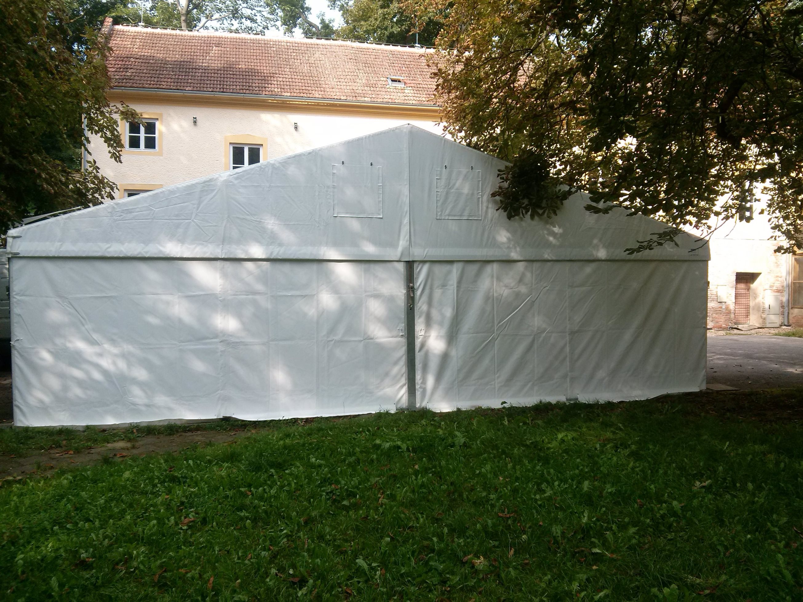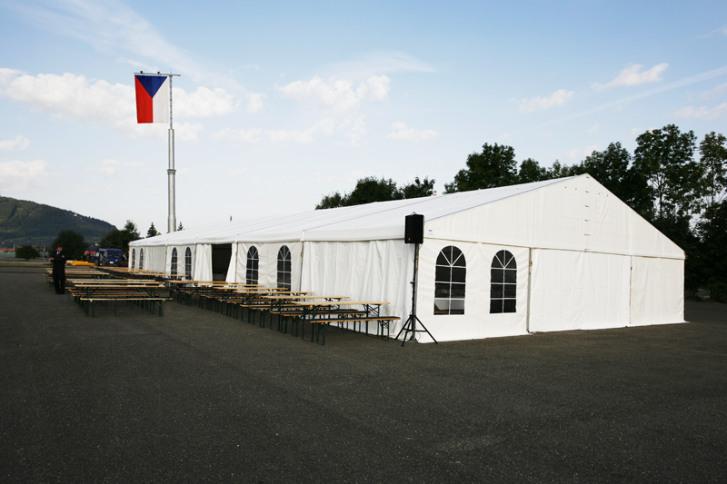Párty stan Beta může být na přání vybaven dveřmi, podlahou, posuvnými vraty, topením, osvětlením, nábytkem atp.