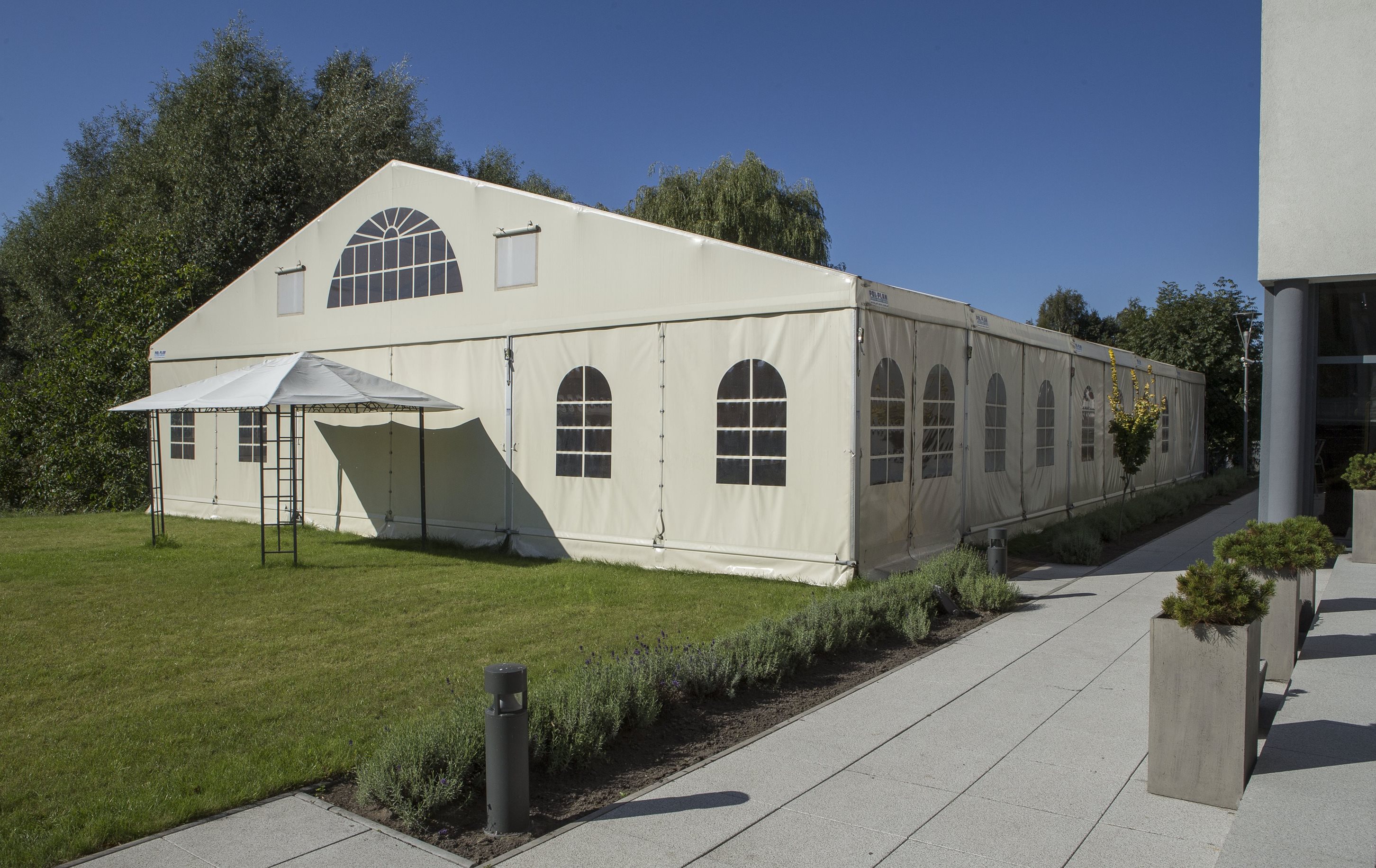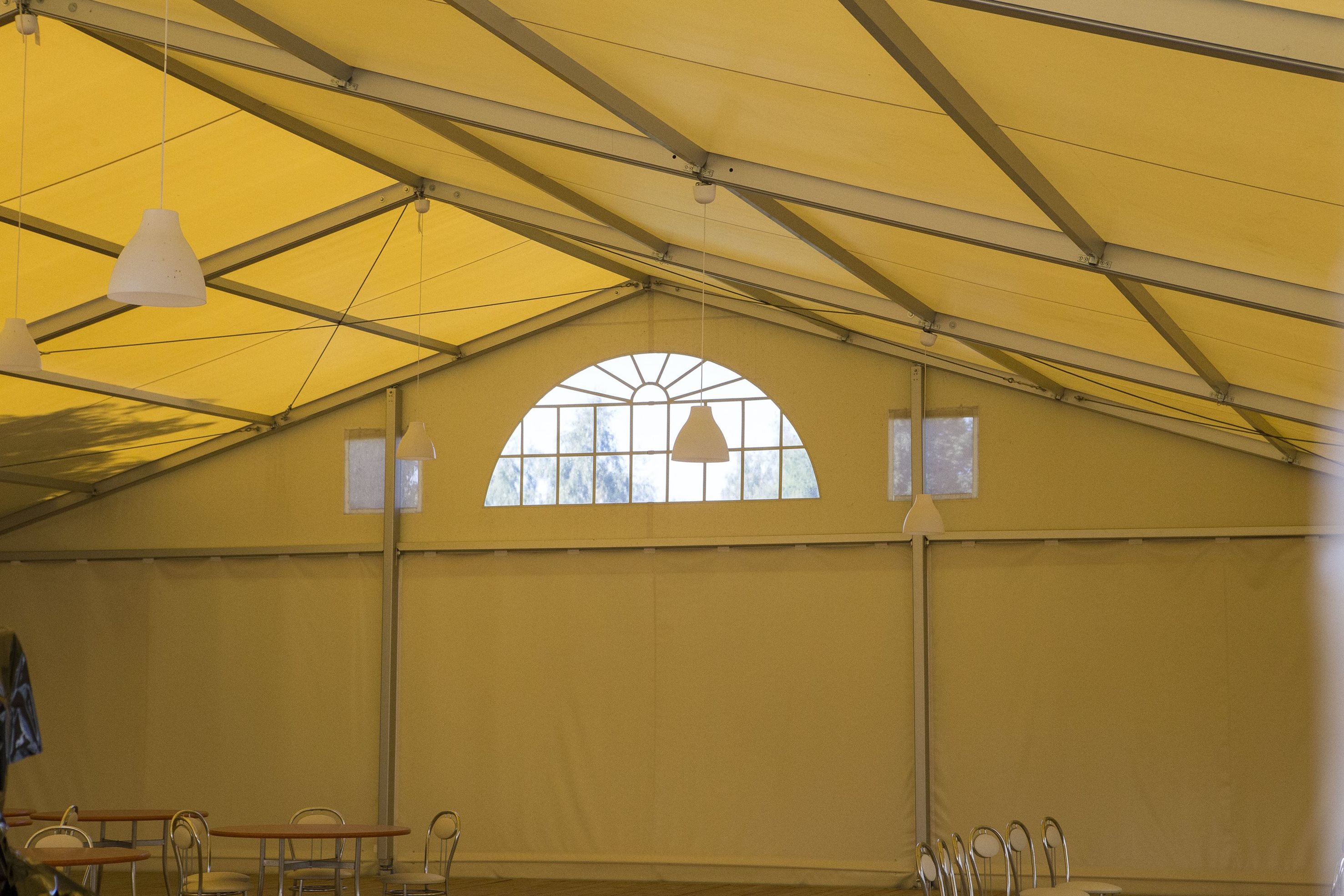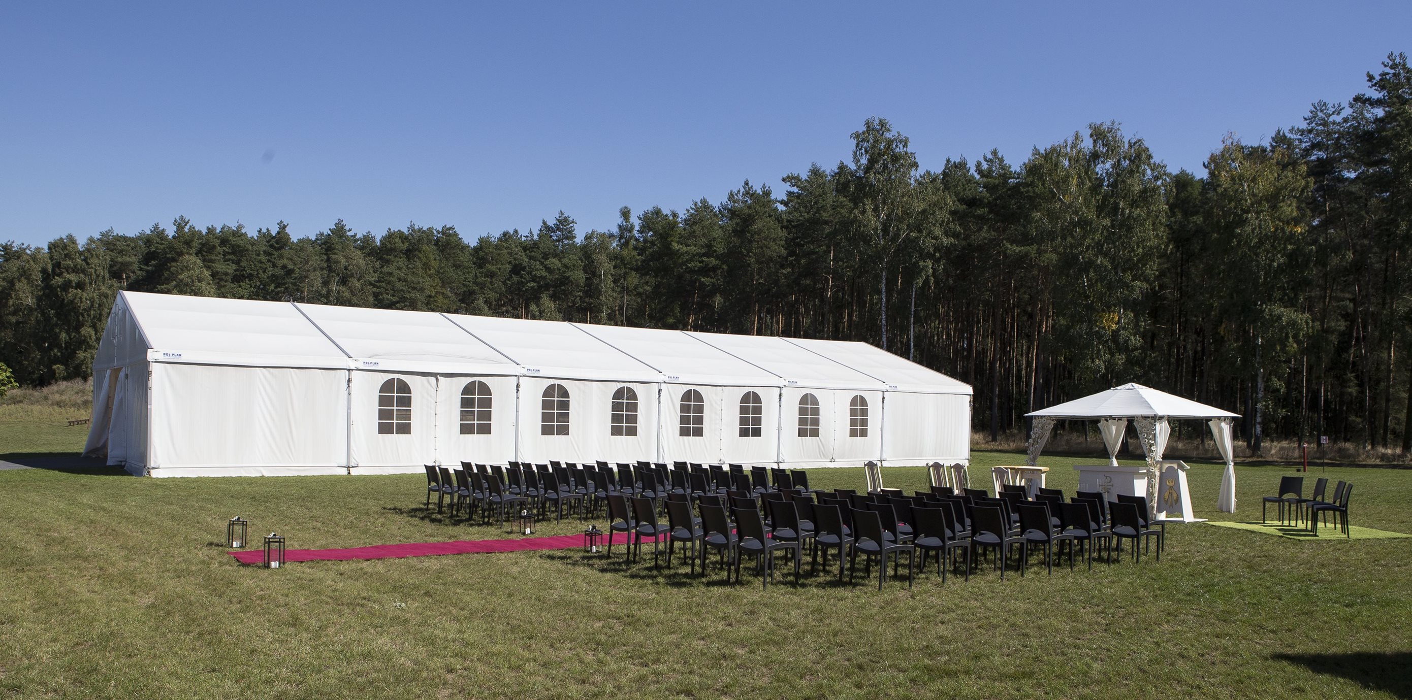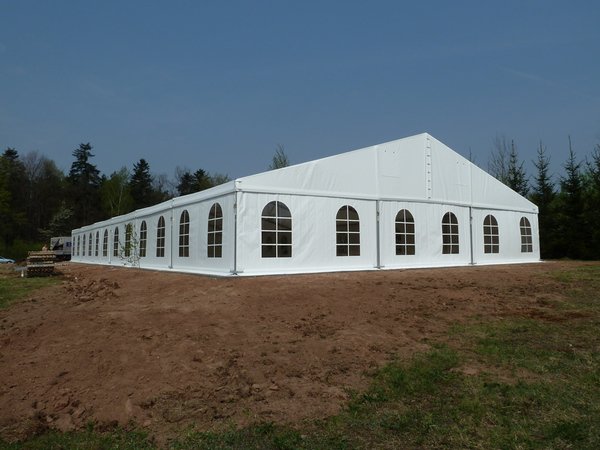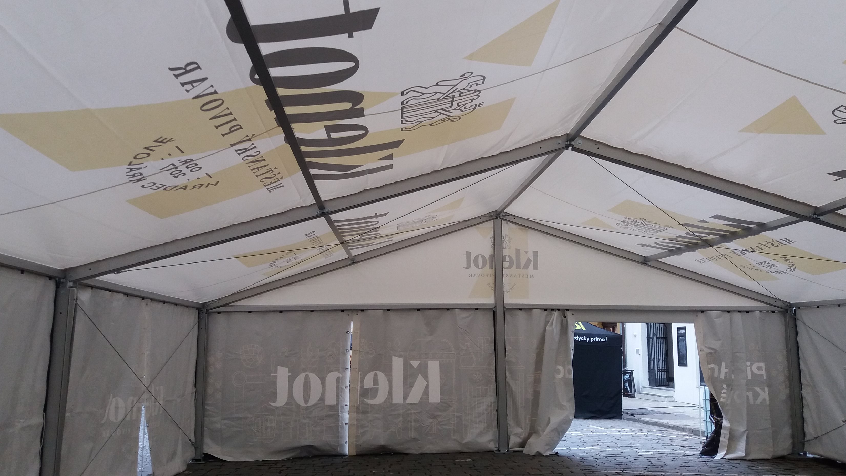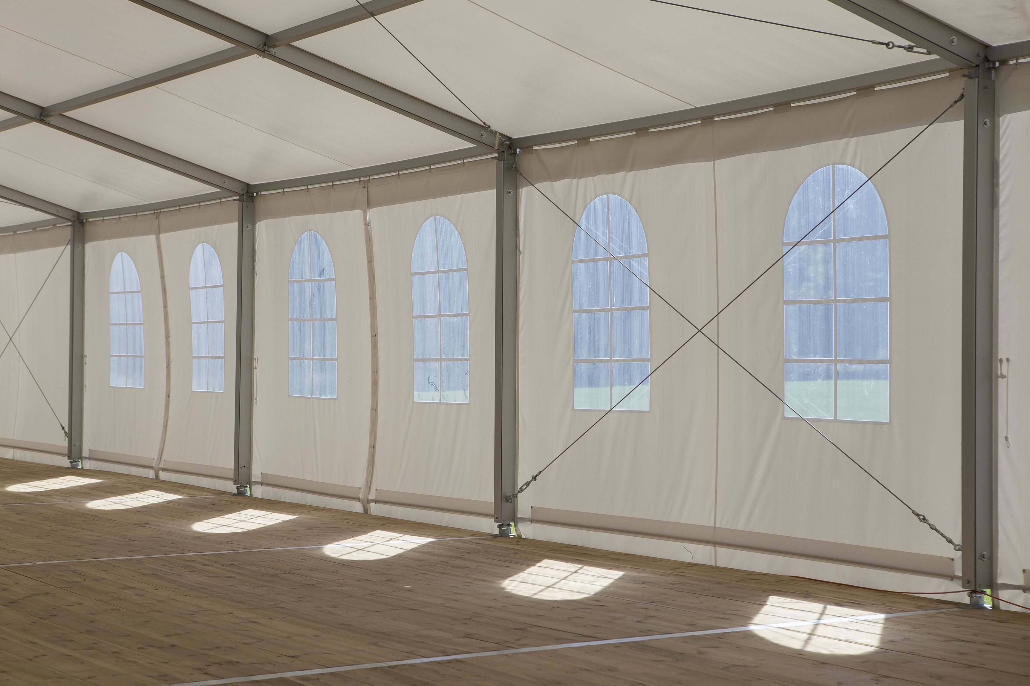Párty stan Beta může být na přání vybaven dveřmi, podlahou, posuvnými vraty, topením, osvětlením, nábytkem atp.