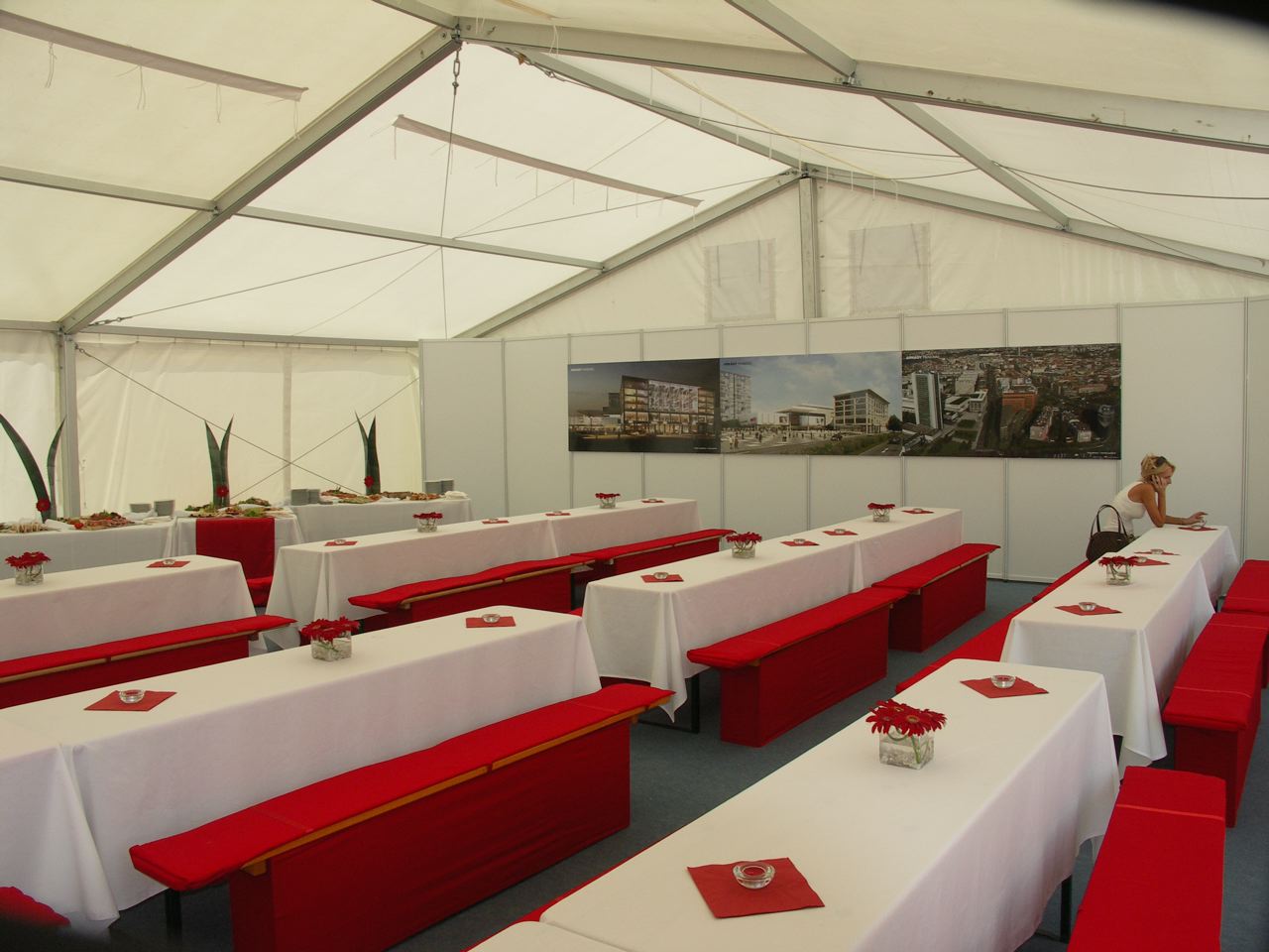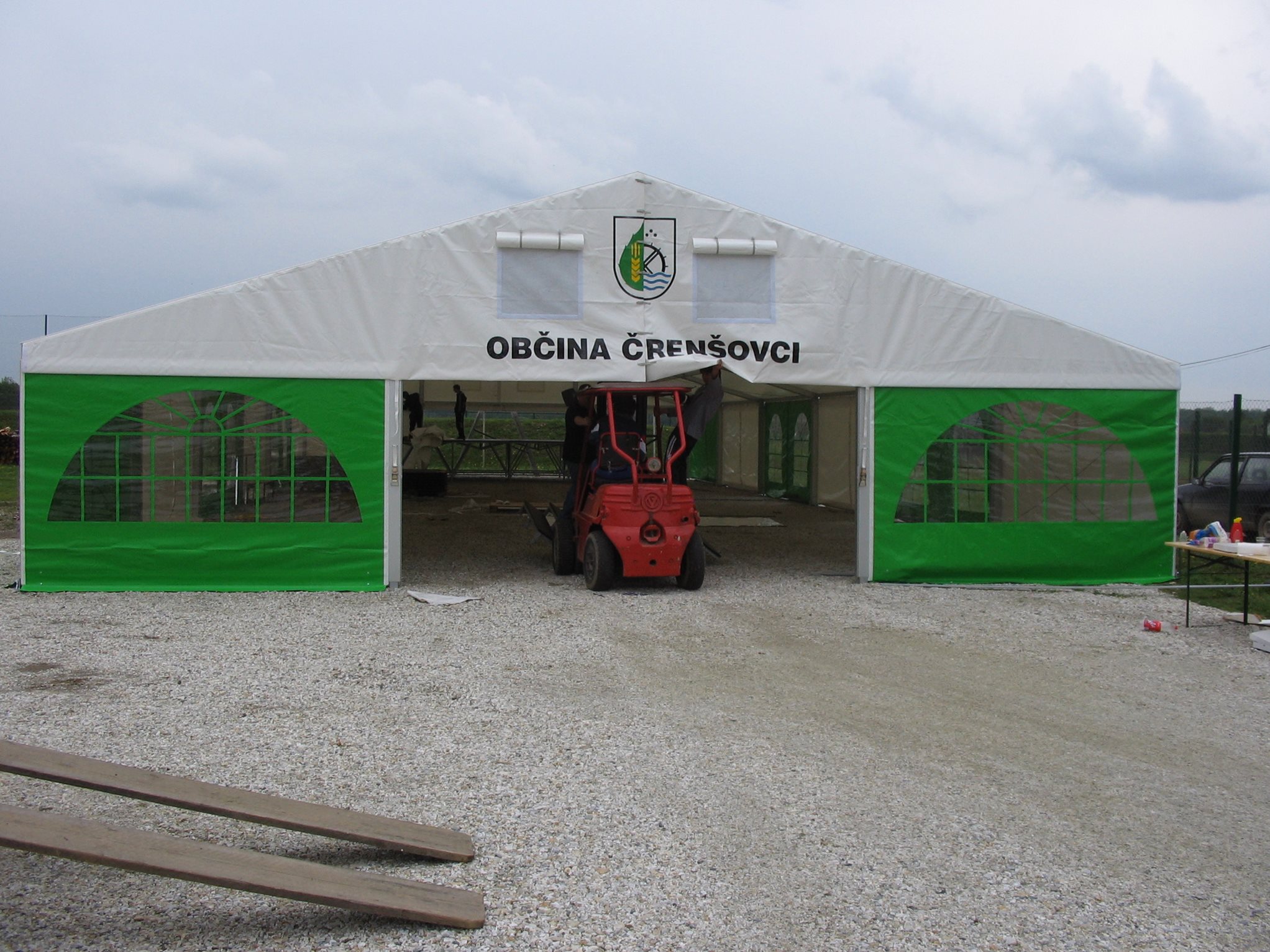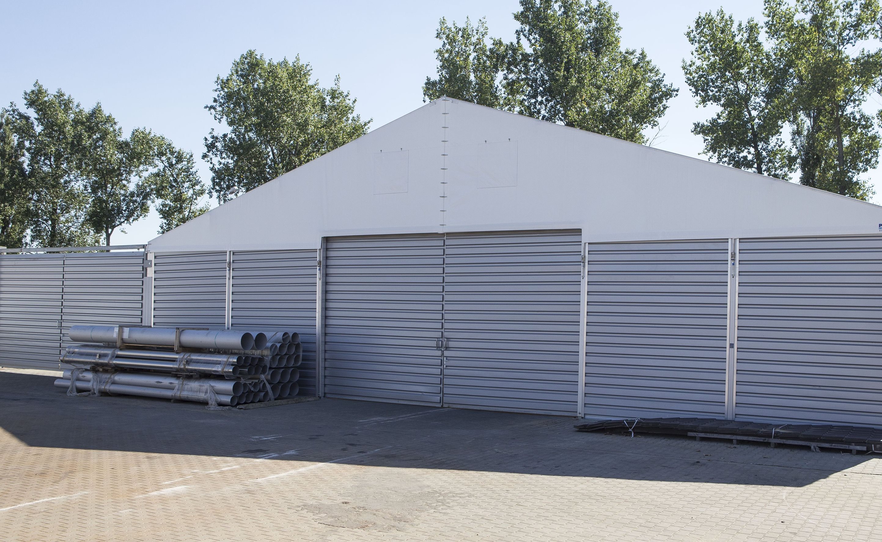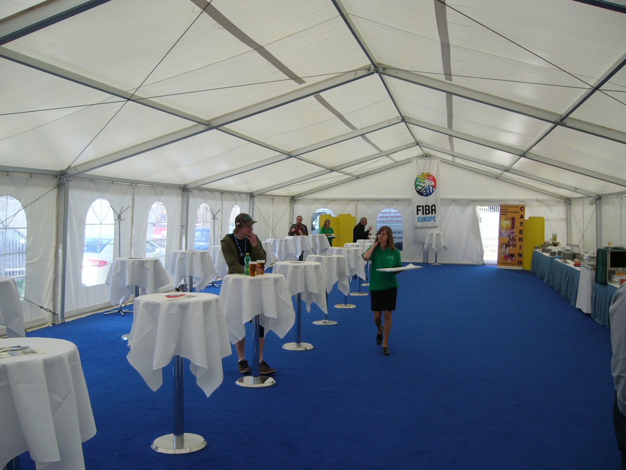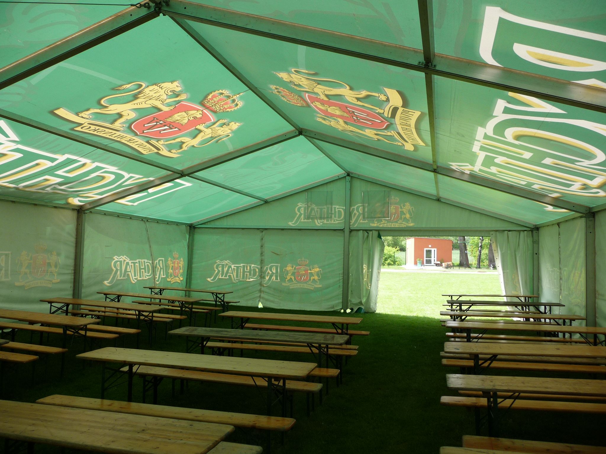 Párty stan Beta může být na přání vybaven dveřmi, podlahou, posuvnými vraty, topením, osvětlením, nábytkem atp.
