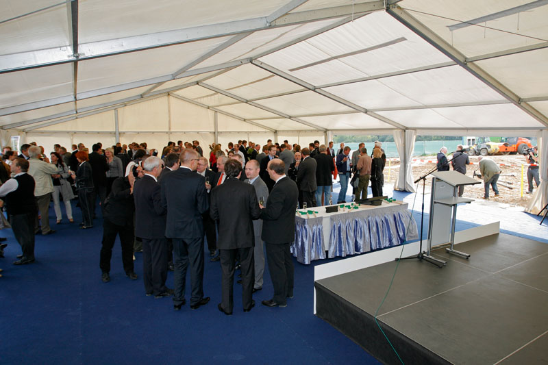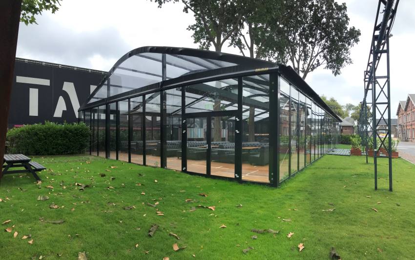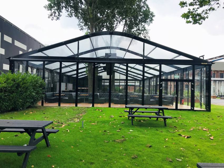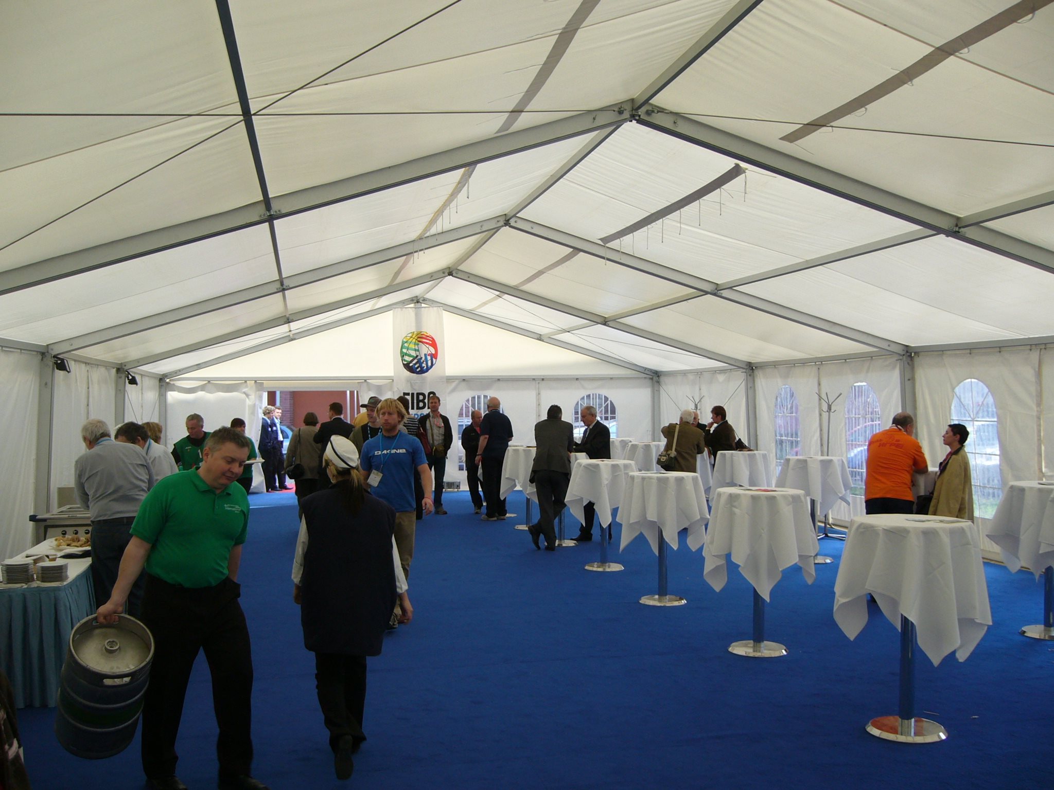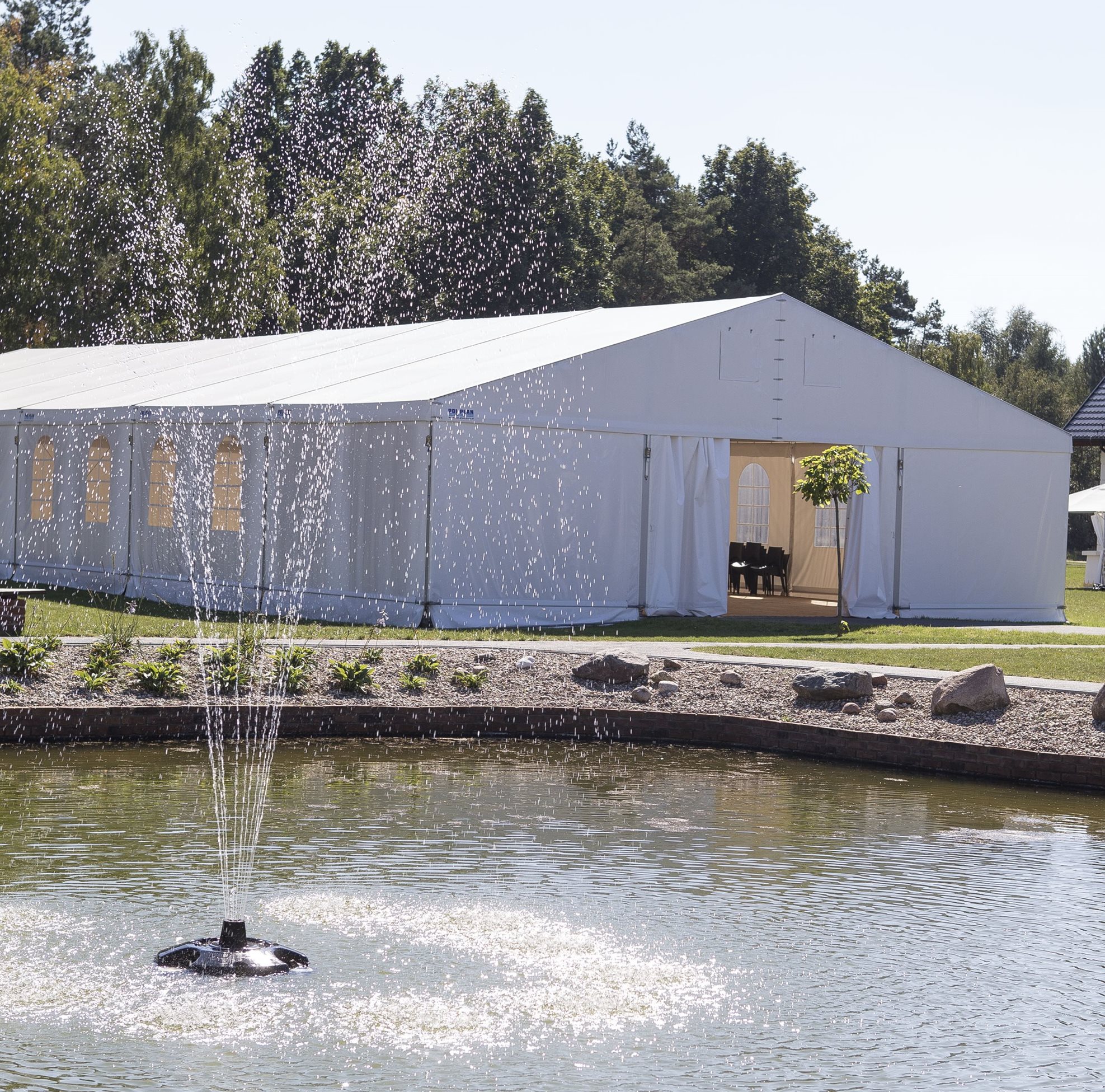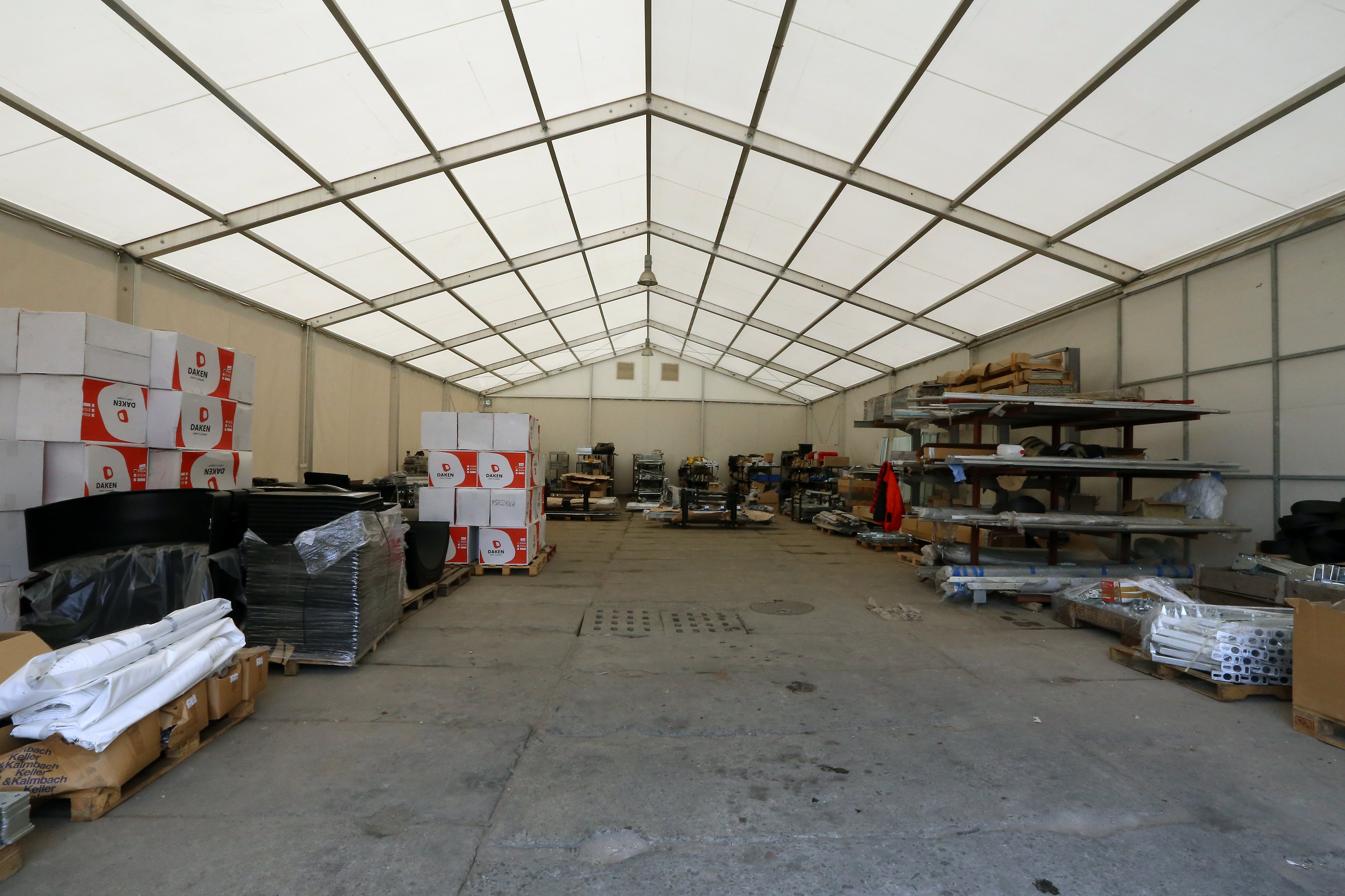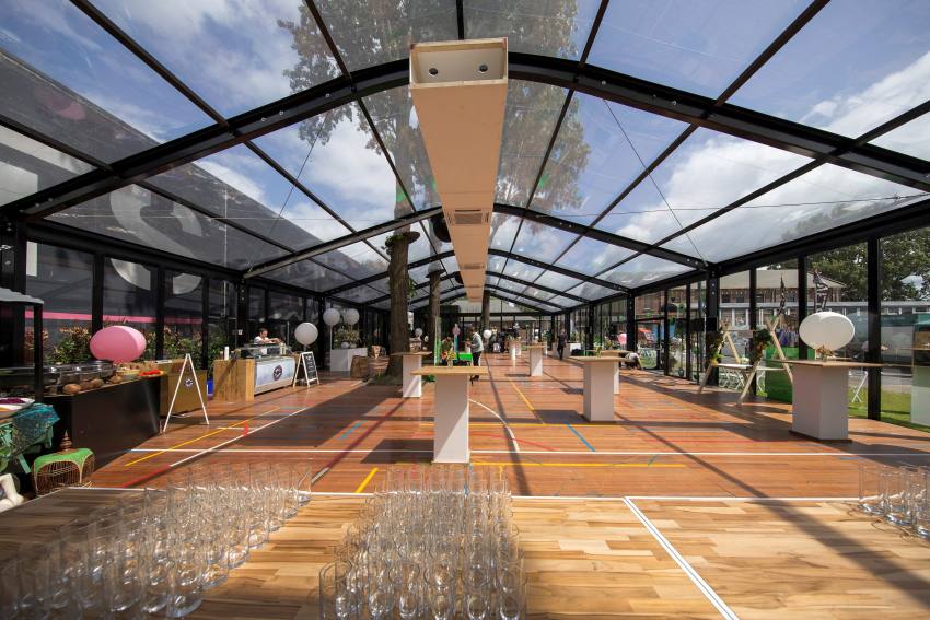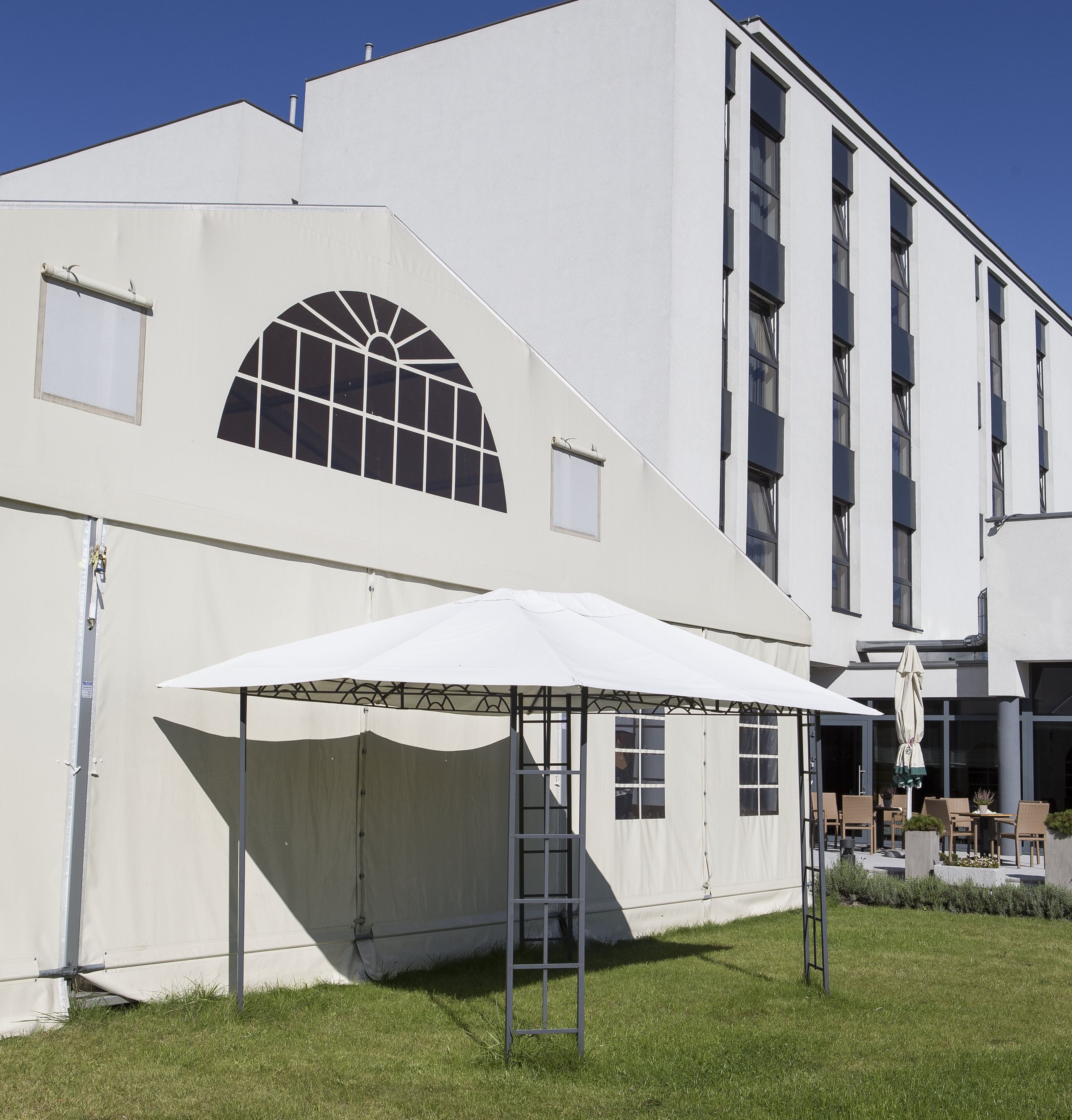 Párty stan Beta může být na přání vybaven dveřmi, podlahou, posuvnými vraty, topením, osvětlením, nábytkem atp.